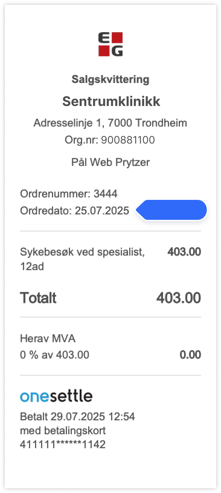 Kvittering i Behandlerportalen - I kvitteringen som kan hentes ut fra Behandlerportalen vises datoen for når pasienten hadde time på klinikken (se hvor).