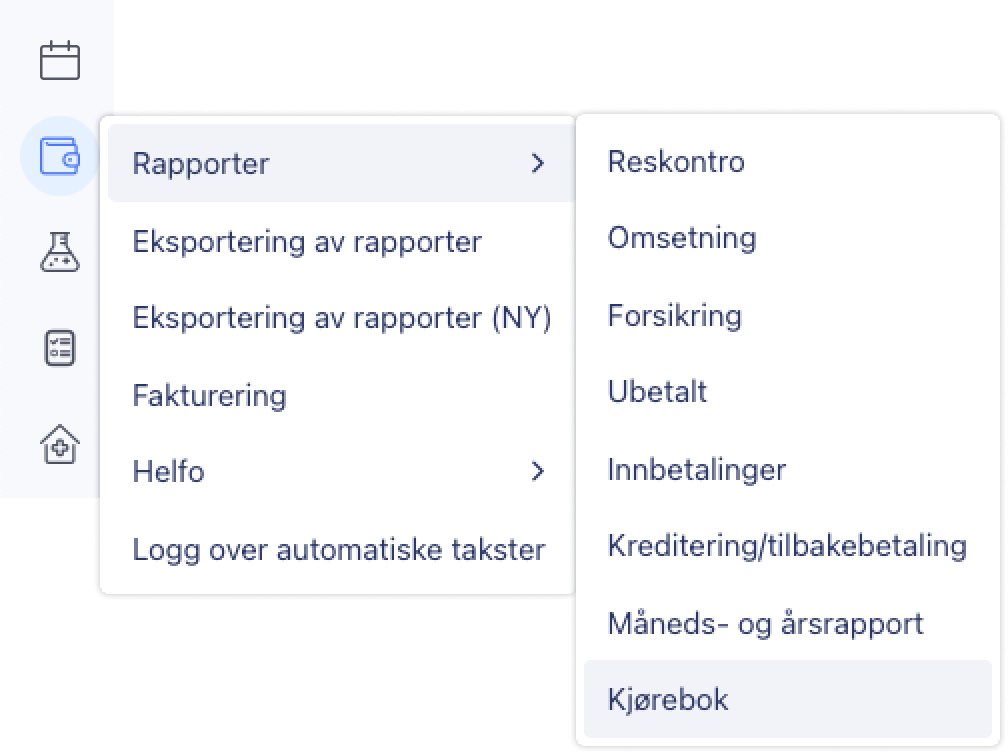 Hold musepekeren over Økonomimodulen, gå til Rapporter og velg Kjørebok (se hvor).