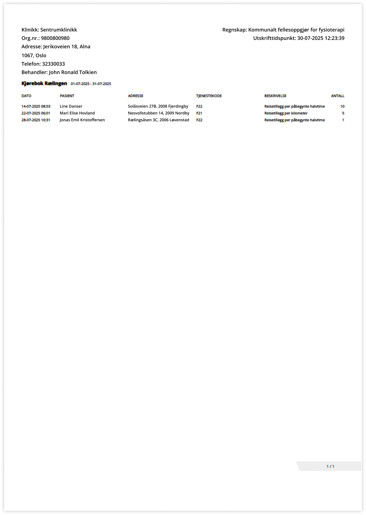 Klikk på Eksporter kjørebok. Se eksempel på kjørebokrapporten med pasientens adresse her.